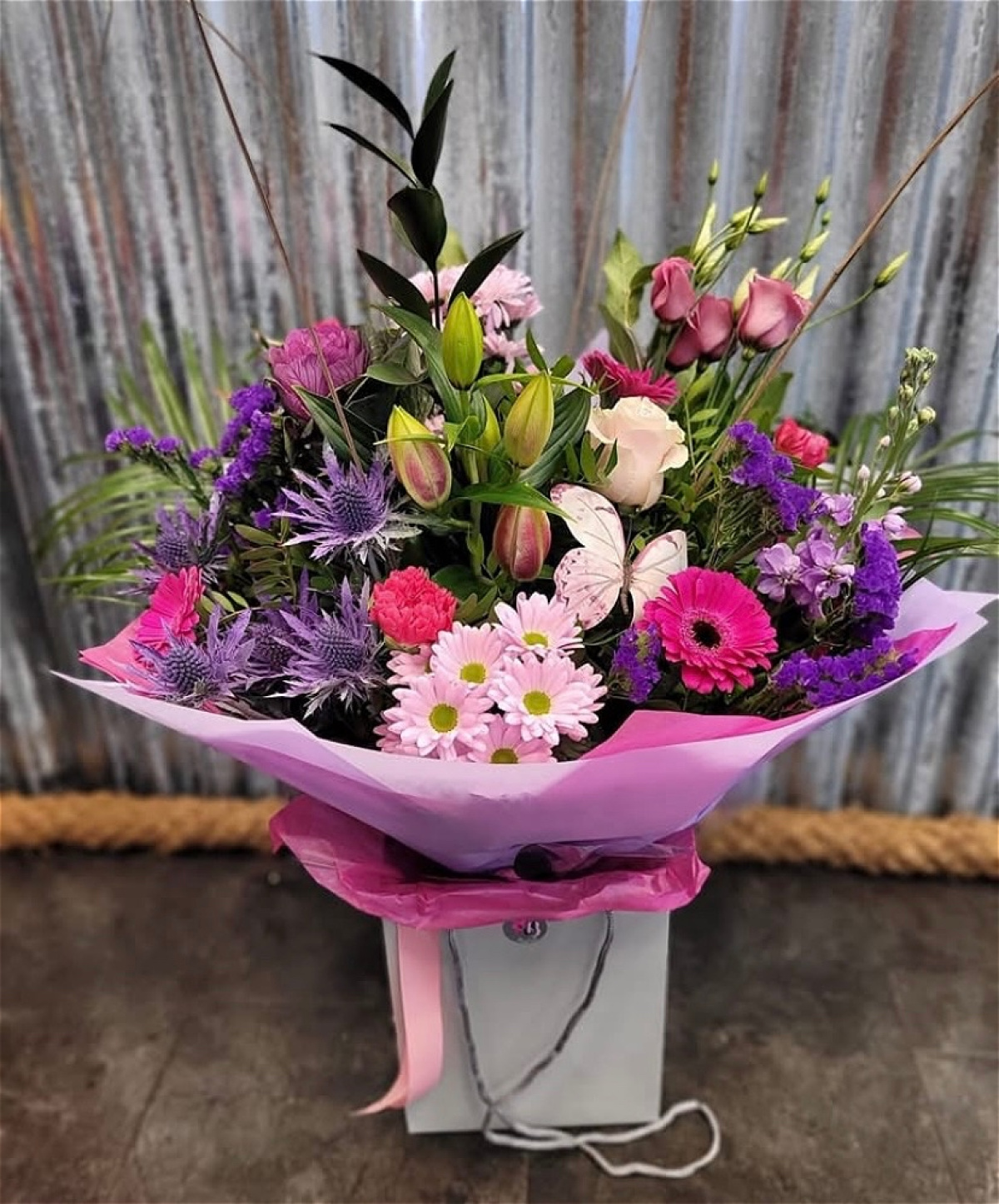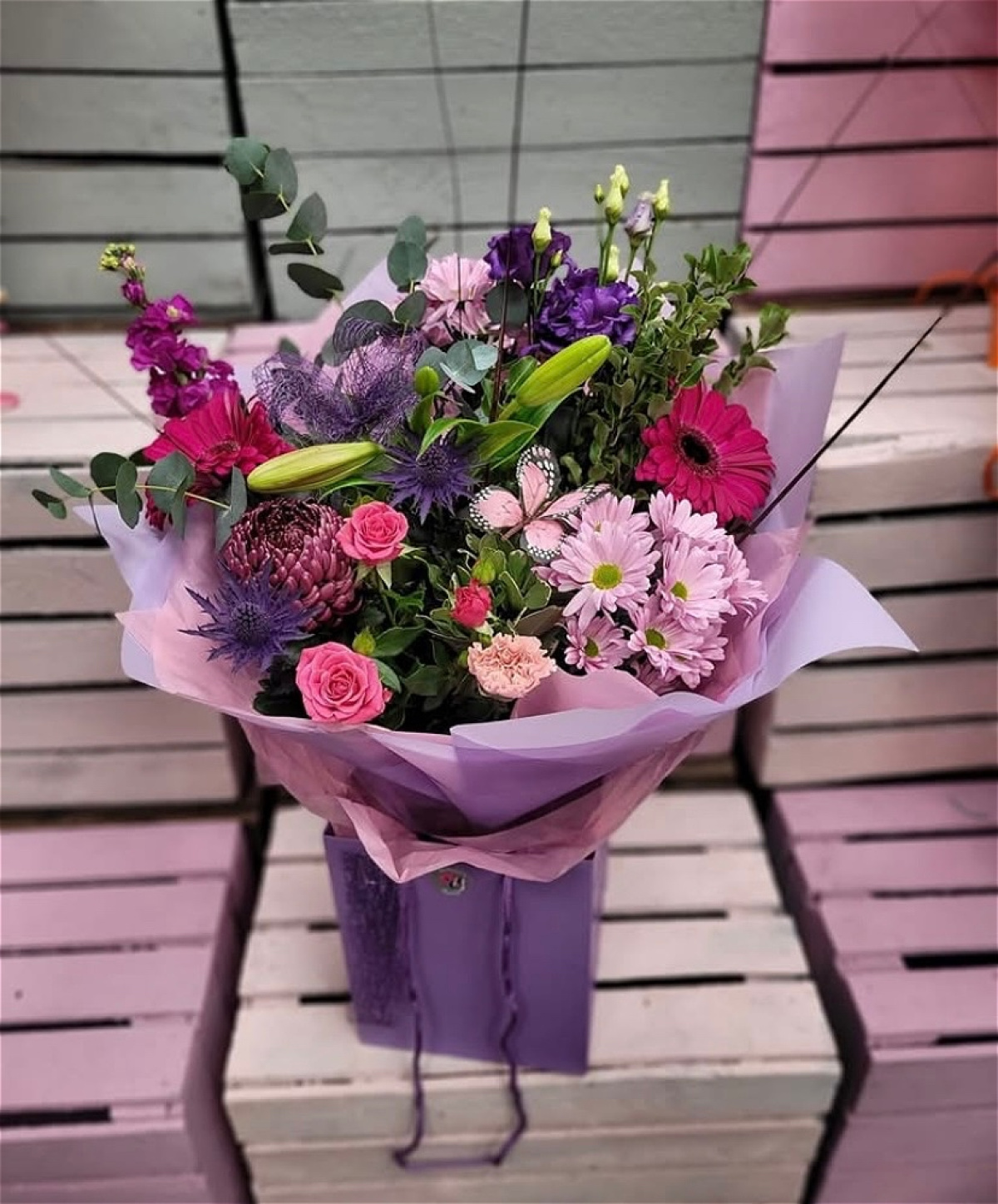 Delicate and vibrant, this hand tied bouquet features a stunning blend of soft pink, hot pink, lavender blooms, carefully selected to create a feminine and graceful colour palette. Specially designed for Mother's day, a beautiful way to show your love.
