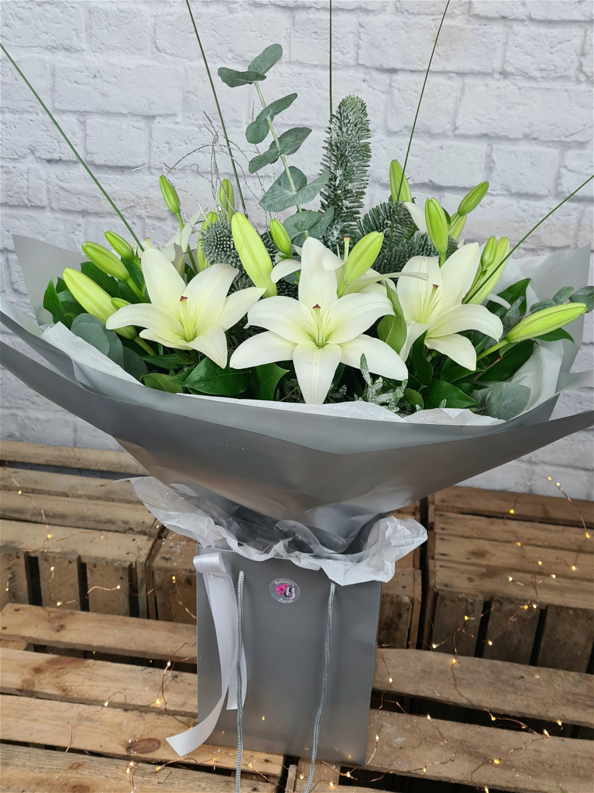 Snowy blue spruce and seasonal foilage surround beautiful white non-scented asiatic lilies in this classic lily bouquet. A sprig of glittered silver grass adds a touch of sparkle.
