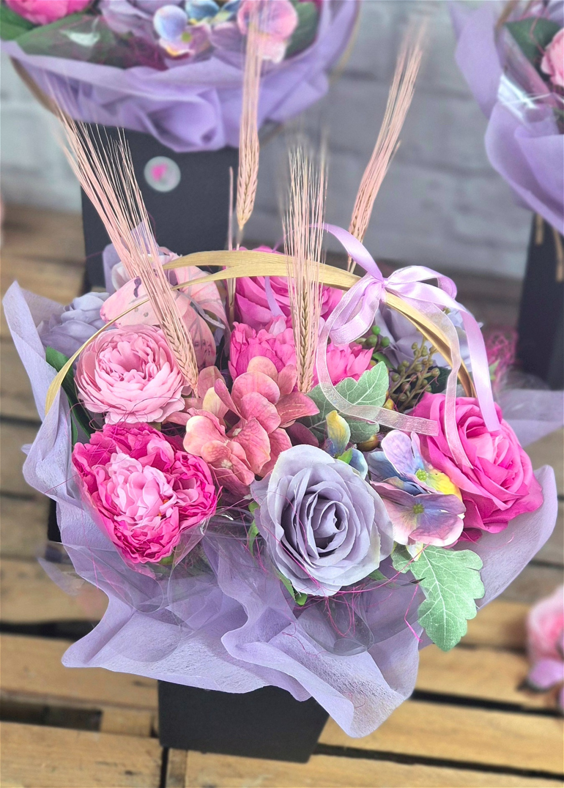 This gorgeous petite arrangement is made using everlasting faux flowers in pretty pink and lavender shades. The flowers are arranged in oasis foam and beautifully gift wrapped making this a gift that will last year after year.