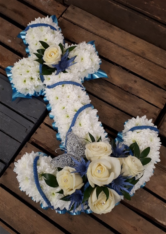 This lovely design is based in white chrysanthemum with a beautiful rose top spray and comes complete with rope detail.