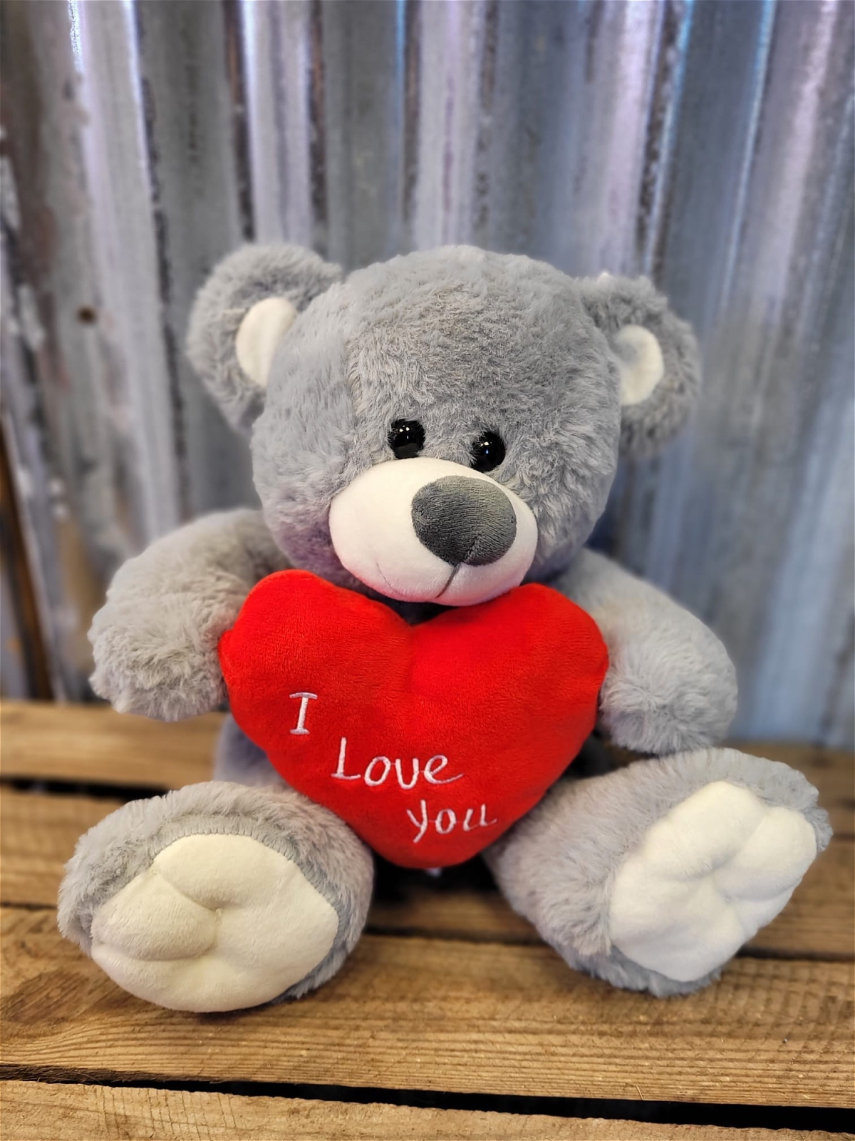 Show your loved one you love them with this cute plush, grey, sitting teddy bear holding a red heart with I love you wrote on.